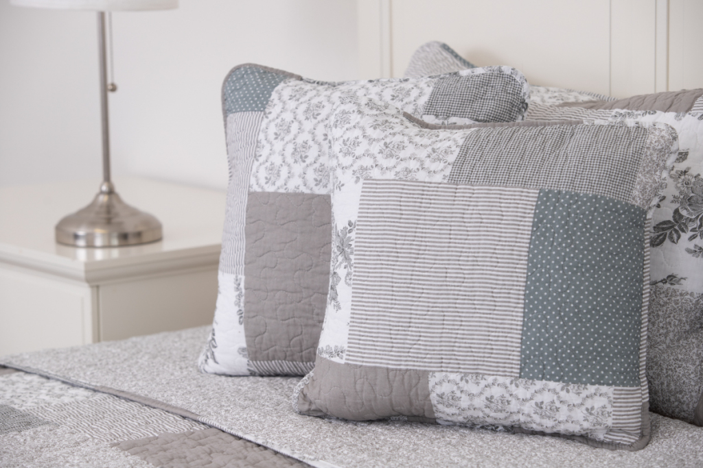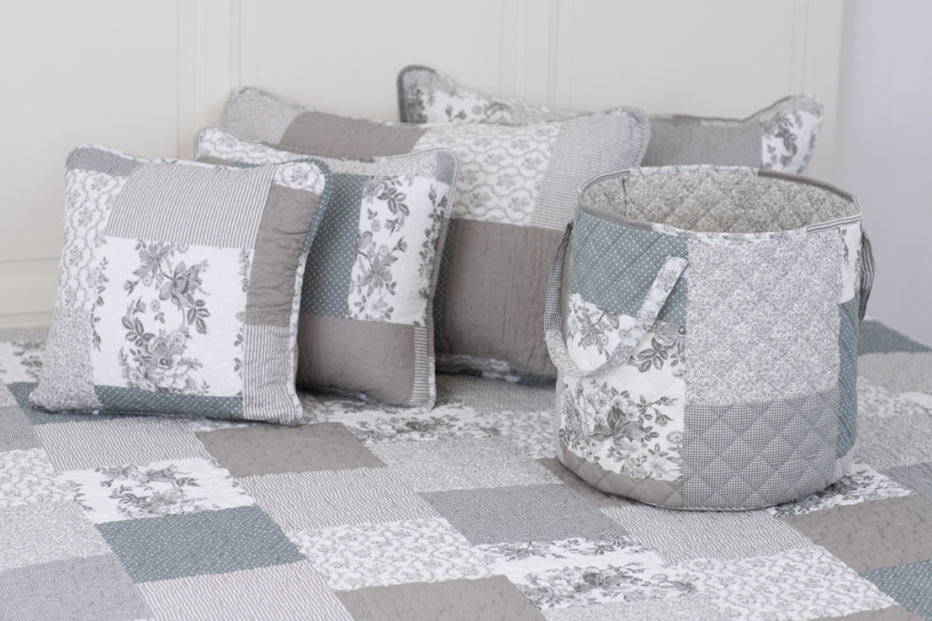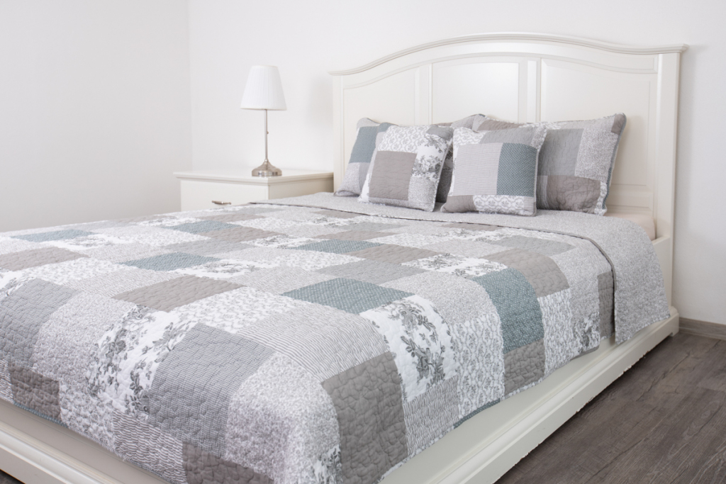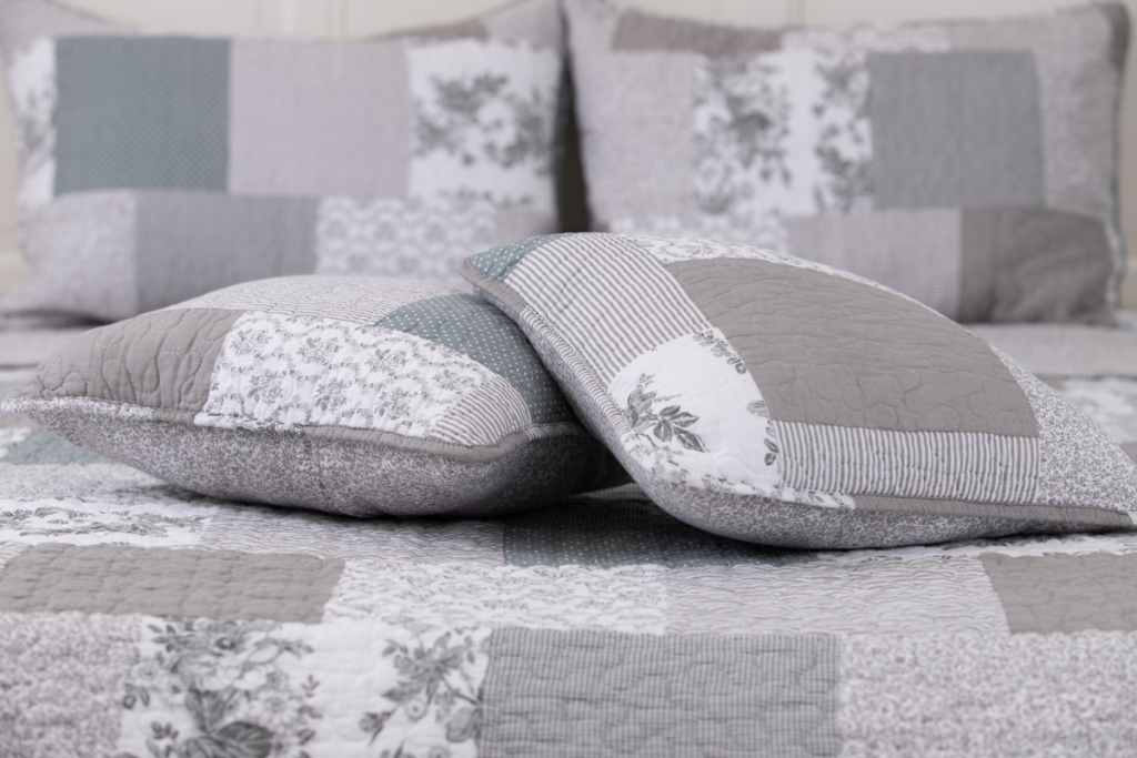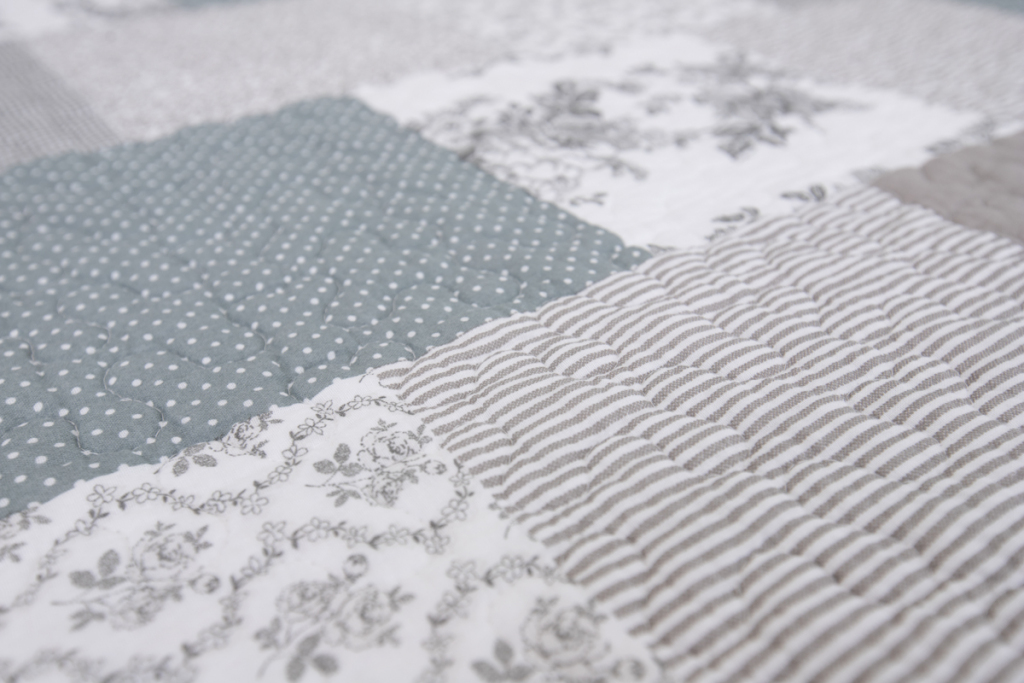Oboustranný prošívaný přehoz přes postel v patchworkovém vzoru, tentokrát s motivy patchworku v odstínech šedobéžové.