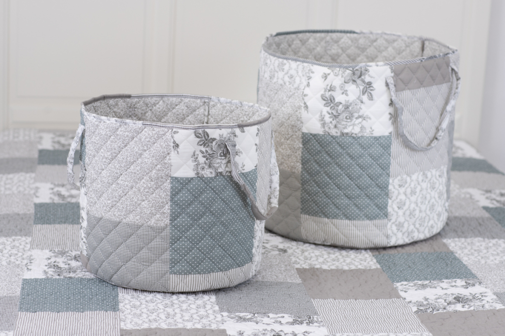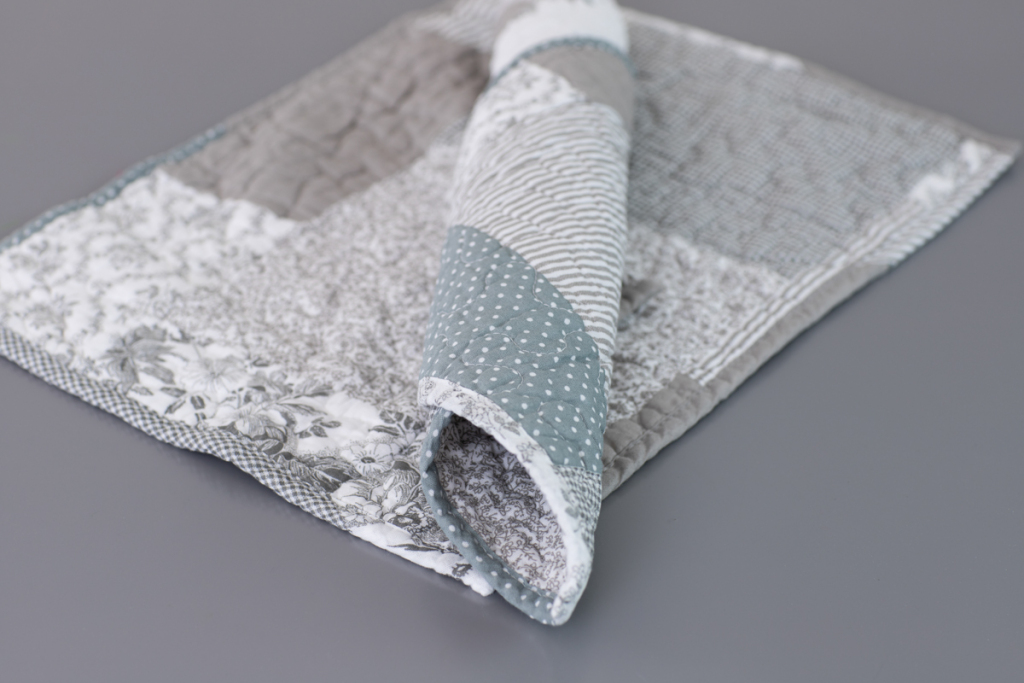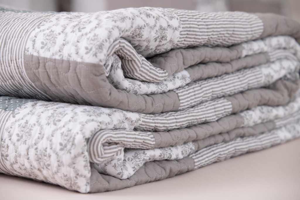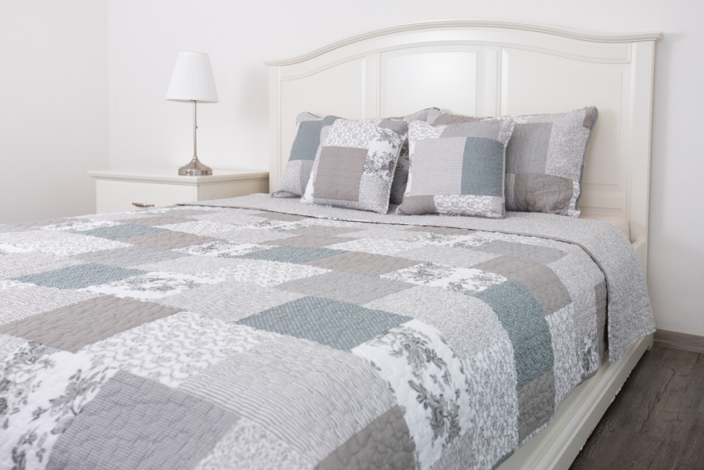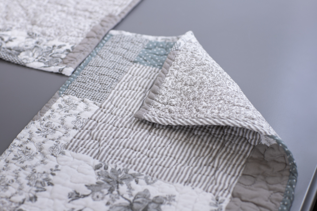 Oboustranný prošívaný přehoz přes postel v patchworkovém vzoru, tentokrát s motivy patchworku v odstínech šedobéžové.
