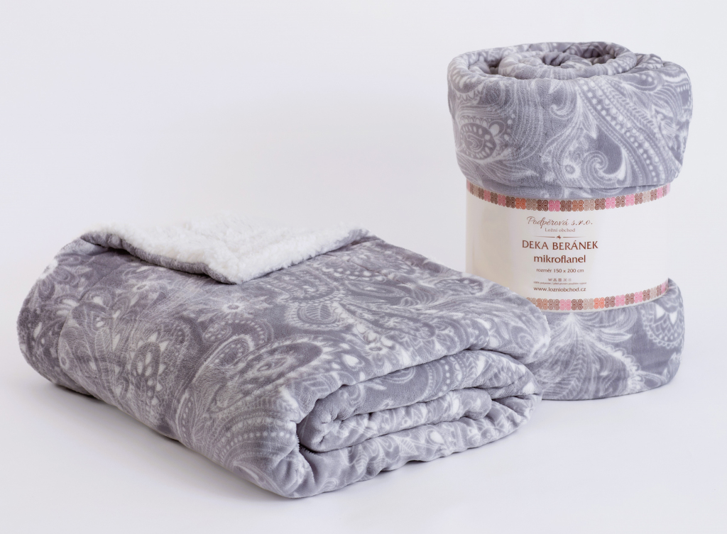 Velmi hebká přikrývka z kvalitního materiálu. Beránková deka je vyrobená z hladkého mikroflanelu v šedé barvě v kombinaci s vysokogramážním beránkem na straně druhé.