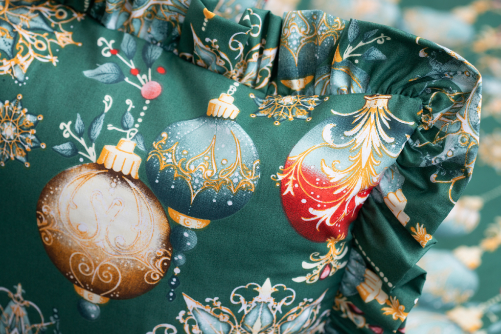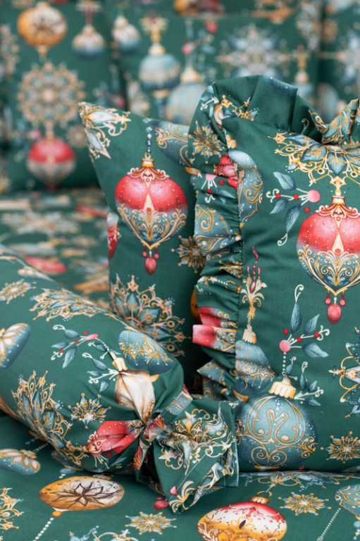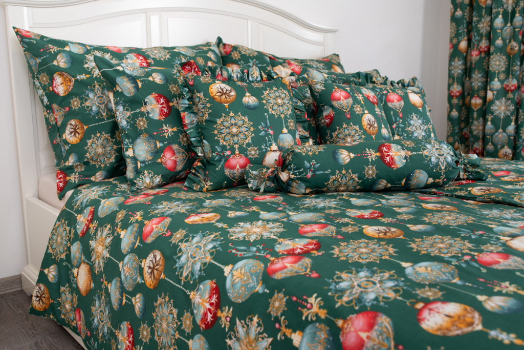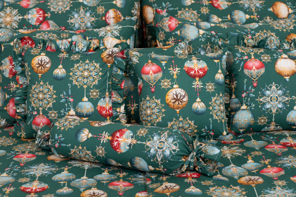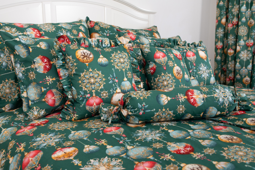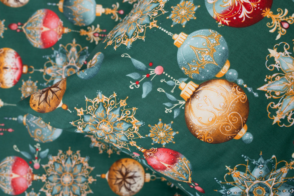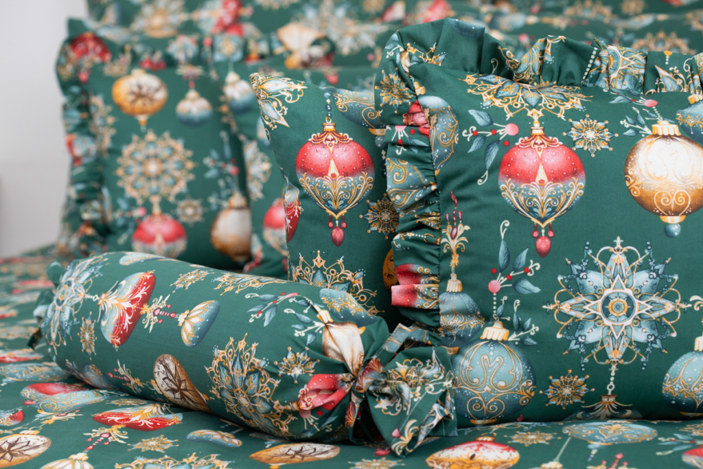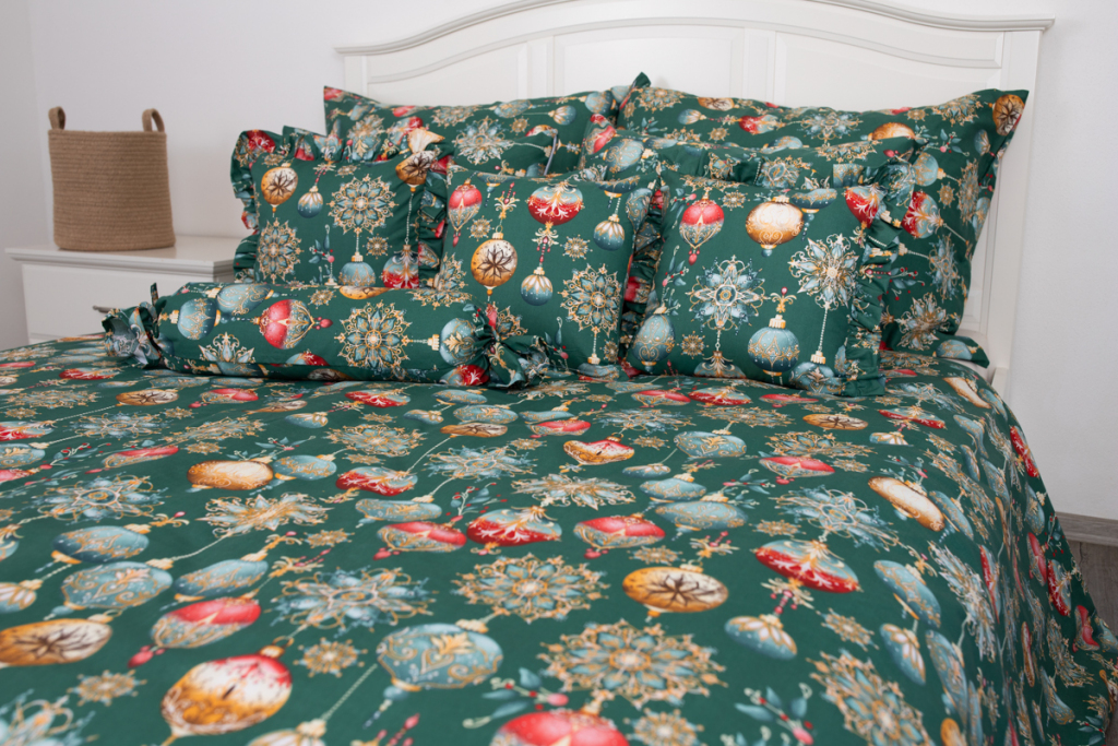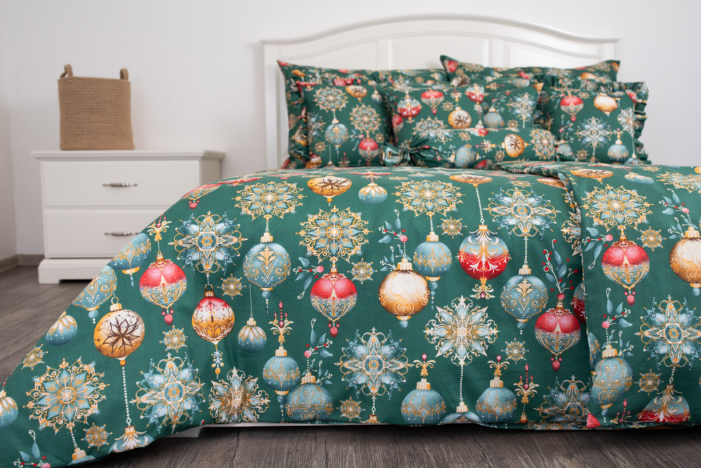 Vánoční bavlněné povlečení s potiskem ozdob v zelené barvě. .